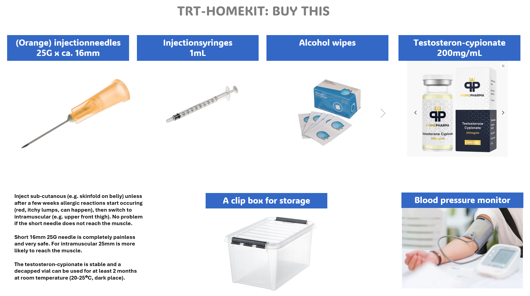 - 200mg/mL Testosterone-cypionate vials (also possible -enanthate, -decanoate)